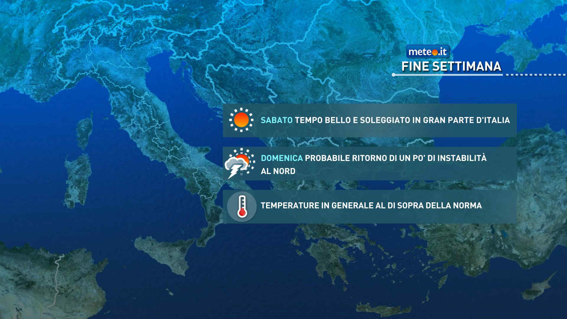Al momento l’evoluzione più probabile mostra l’arrivo dei primi rovesci o temporali sulle zone montuose alpine e ed appenniniche e un successivo possibile coinvolgimento, più verso sera-notte della pianura padana e delle coste adriatiche. Al Centro-Sud non avremo cambiamenti, con l’alta pressione che continuerà a dominare e a garantire una domenica stabile e ben soleggiata. I venti saranno ovunque di debole intensità. I mari del Sud potranno risultare anche localmente un po’ mossi; generalmente calmi saranno invece i mari del Centro-Nord e quelli intorno alla Sardegna.