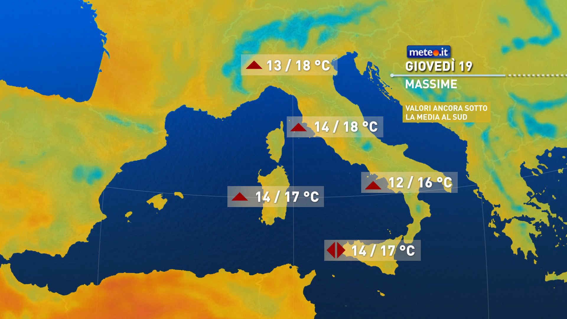 Temperature massime in leggero rialzo nelle regioni meridionali, in lieve calo altrove; valori per lo più nella media o leggermente sotto. Ancora un po’ ventilato per venti da nord o nord-est.