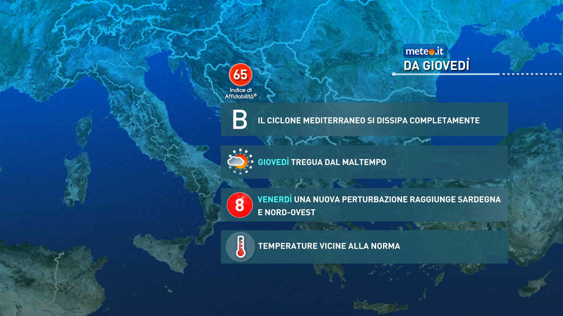 Venerdì, come accennato in precedenza, una perturbazione atlantica avanzerà lentamente sospinta da correnti occidentali. La probabilità di precipitazioni crescerà soprattutto sulle regioni nordoccidentali (in particolare in Liguria), sulle regioni centrali tirreniche e sulla Sardegna occidentale; non escluse delle piogge anche in Campania e sulla Sicilia occidentale. Sulle aree alpine del Nordovest la neve dovrebbe cadere sopra 800-1000 metri circa. Venti per lo più deboli.