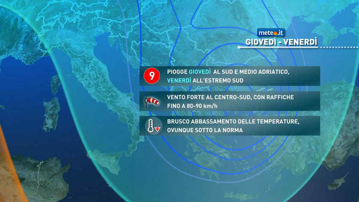 Le correnti fredde che accompagnano il sistema perturbato favoriranno anche un sensibile e diffuso abbassamento delle temperature: tra domani e sabato ci attendono quindi giornate insolitamente fredde, con temperature di qualche grado al di sotto della norma.