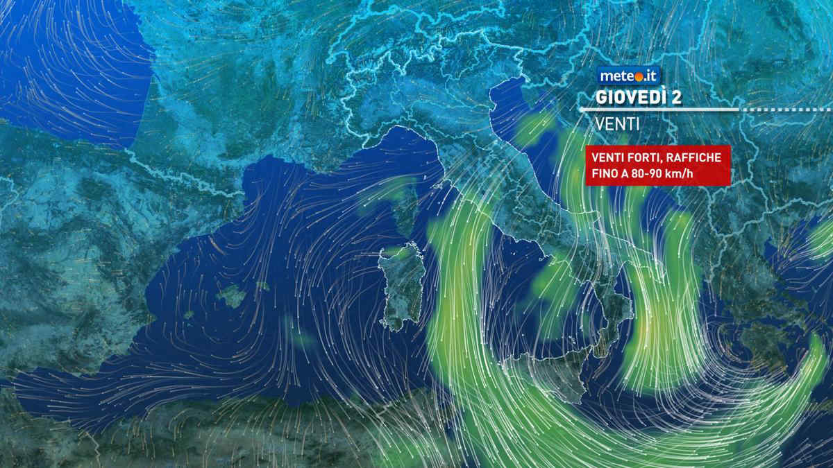 Temperature massime in calo, soprattutto al Sud e medio versante adriatico: valori ovunque al di sotto delle medie stagionali. Venti forti dai quadranti settentrionali sui mari del Centro-Sud e Isole, con raffiche di burrasca fino a 80-90 Km/h; mari mossi o molto mossi, localmente fino ad agitati.