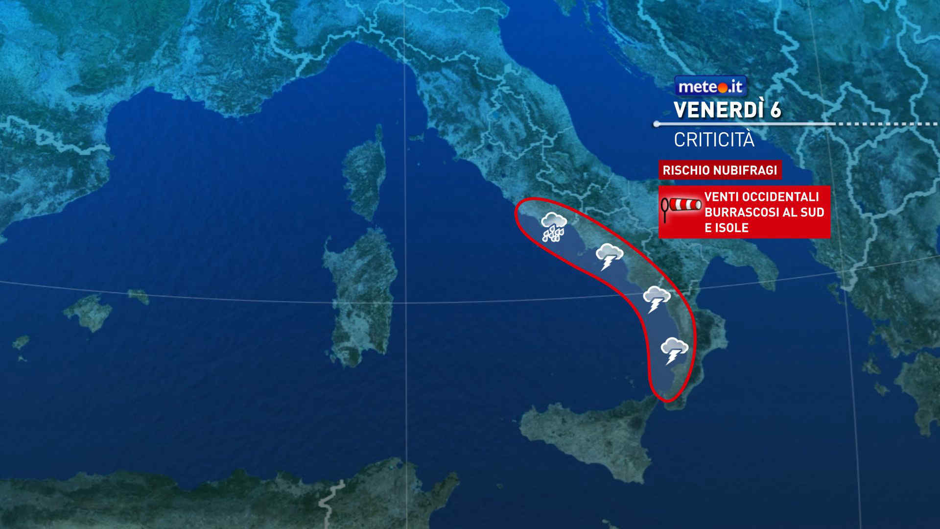 Temperature massime in rialzo al Centro-Sud. Venti molto forti su Isole, Centro-Sud e tutti mari; raffiche prossime ai 100 km/h possibili al Sud e in Appennino.