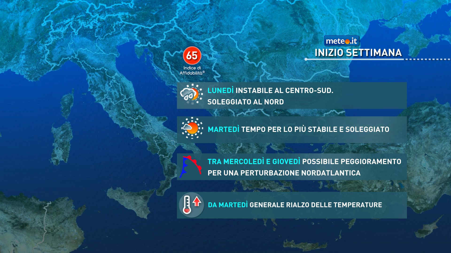 Lunedì, in particolare, maggiore probabilità di rovesci nel pomeriggio e in prima serata sulle regioni insulari e centro-meridionali: particolarmente su Toscana orientale, Umbria, Lazio, Abruzzo, Molie, Basilicata, Calabria, Sicilia orientale e Sardegna, con il rischio anche di temporali. In Appennino i fenomeni assumeranno carattere nevoso oltre i 1200-1500 metri circa. Al Nord tempo in prevalenza soleggiato, con addensamenti pomeridiani nel settore alpino e prealpino centro-orientale, lungo l’arco ligure e la dorsale appenninica emiliano-romagnola. Venti in prevalenza deboli, solo localmente moderati, dai quadranti settentrionali, ma con temporanei rinforzi nelle aree temporalesche. Temperature in rialzo nei valori massimi al Nord, più sensibile al Nord-Ovest, in lieve calo al Sud e sulle Isole.