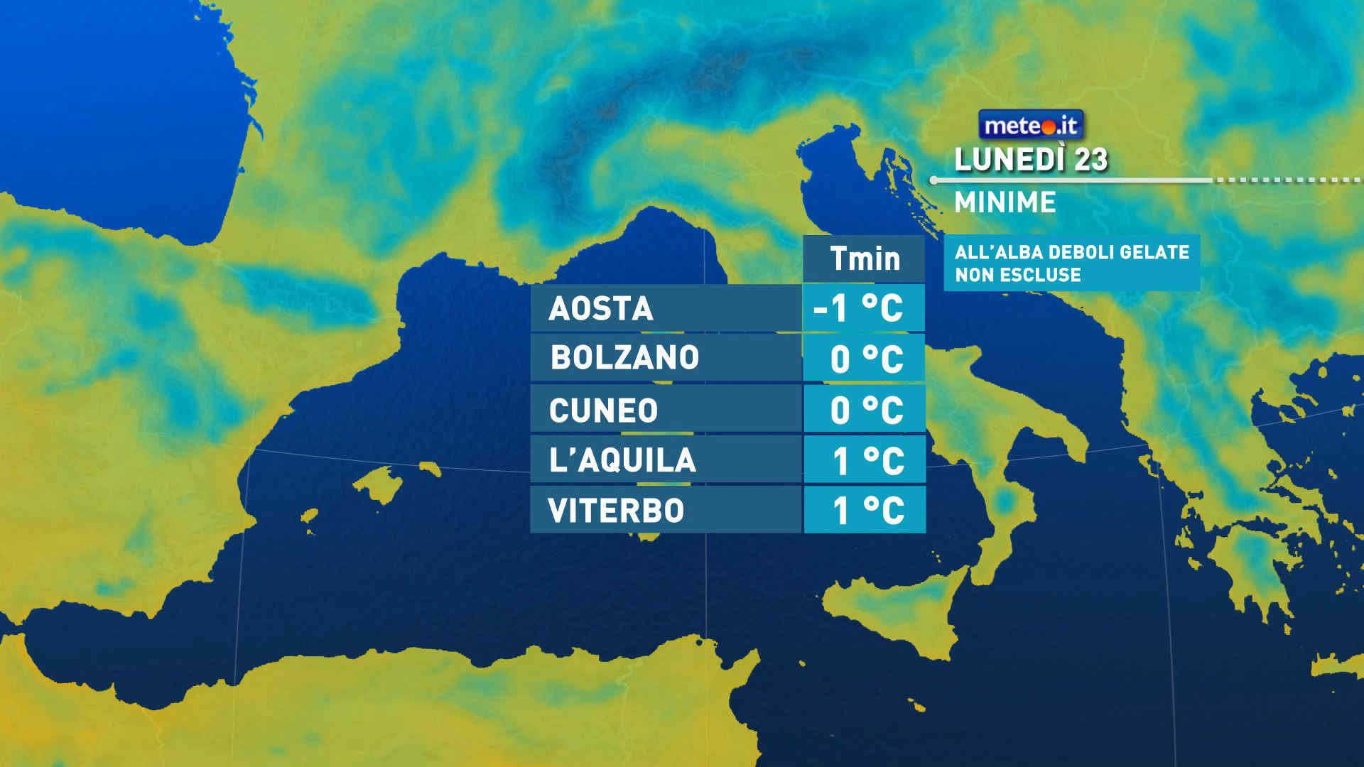 Temperature minime in calo, con valori all’alba anche poco sopra lo zero in molte aree del Nord; massime in rialzo al Nord. Venti deboli. Mari calmi o poco mossi.