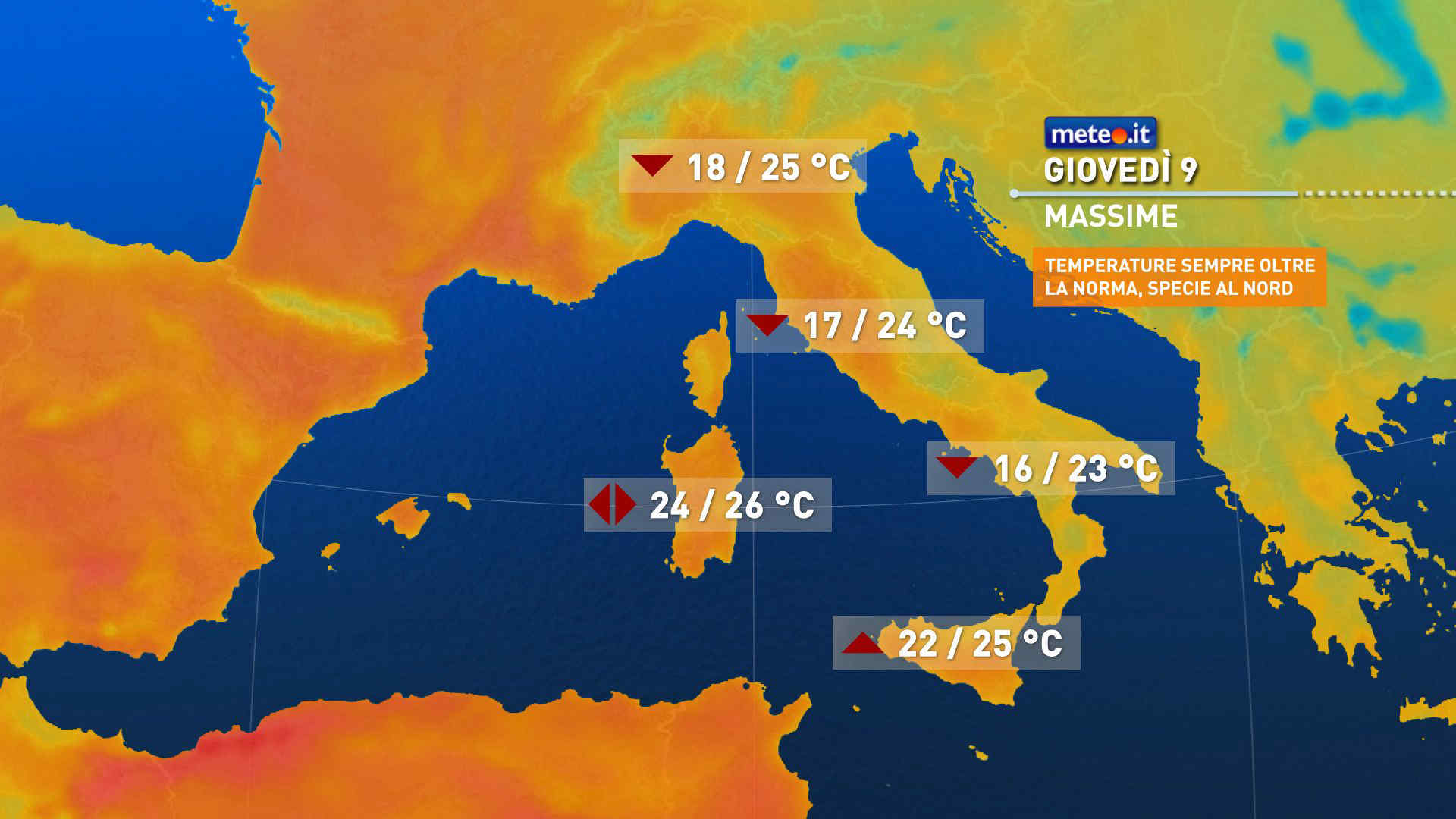 Giovedì cielo sereno o poco nuvoloso in gran parte dell’Italia, con temporanei e innocui annuvolamenti al Nordest e, nel pomeriggio, lungo le zone appenniniche. In serata nuvole in aumento tra Puglia e Basilicata. Venti a tratti moderati in Puglia, basso Adriatico e Ionio, in prevalenza deboli altrove. Temperature massime in calo al Sud e regioni centrali adriatiche, ma che restano in generale al di sopra della norma, in particolare al Nord.