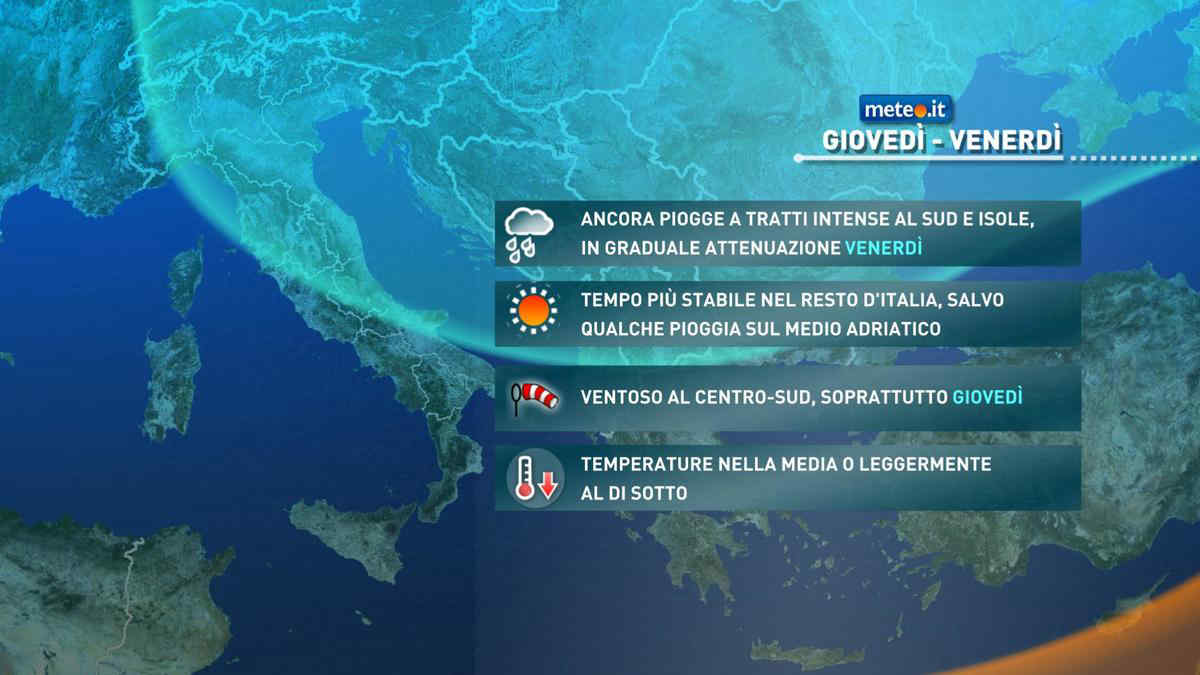 Venerdì le regioni meridionali e quelle del medio Adriatico saranno interessate ancora da piogge e locali rovesci, ma con tendenza a un graduale miglioramento nella seconda parte del giorno. Nel frattempo, infiltrazioni di aria più fredda da est determineranno un ridimensionamento delle temperature che in diverse zone scenderanno leggermente al di sotto della norma.
