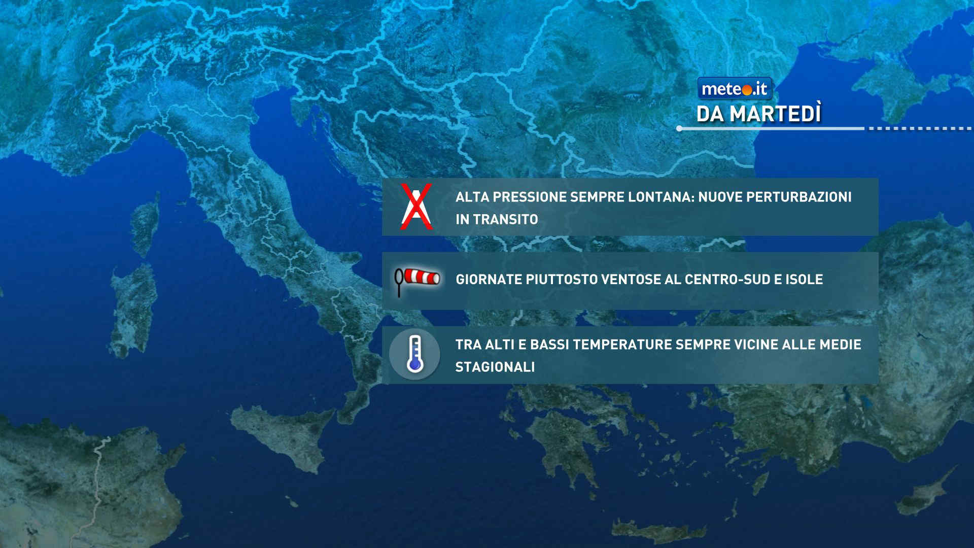 Dal punto di vista termico non si intravedono irruzioni fredde da qui a fine mese, stante il tipo di circolazione atmosferica attesa sull’Europa meridionale. Le temperature si manterranno prossime alla norma o temporaneamente anche al di sopra sulle regioni centro-meridionali.