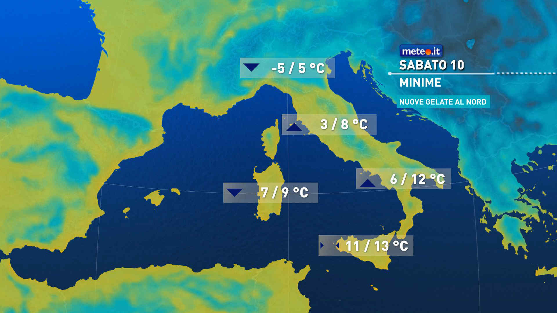 Venti fino a tempestosi di Maestrale al Sud e sulle Isole, con raffiche ben oltre i 100 Km/h. Agitati o molto agitati i mari di ponente e lo Ionio, con mareggiate lungo le coste esposte. Temperature minime quasi dappertutto in diminuzione, gelate diffuse all’alba in val padana. Massime in lieve rialzo in gran parte del Nord (ma comunque non oltre 5-6 gradi a bassa quota), ad eccezione delle zone alpine; in calo nel resto d’Italia.