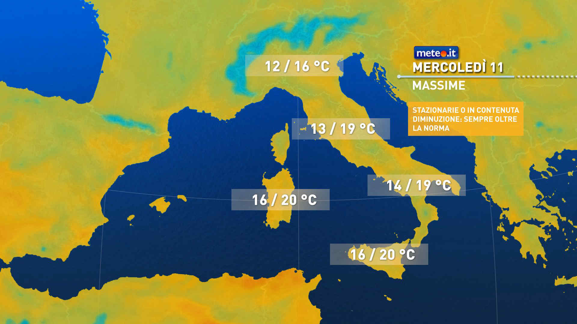 Temperature in rialzo nei valori massimi al Nord-Ovest e ancora sopra la media su gran parte del Paese. Venti fino a moderati da est-sudest nei canali delle Isole, con mari mossi; altrove venti deboli e mari poco mossi o calmi.
