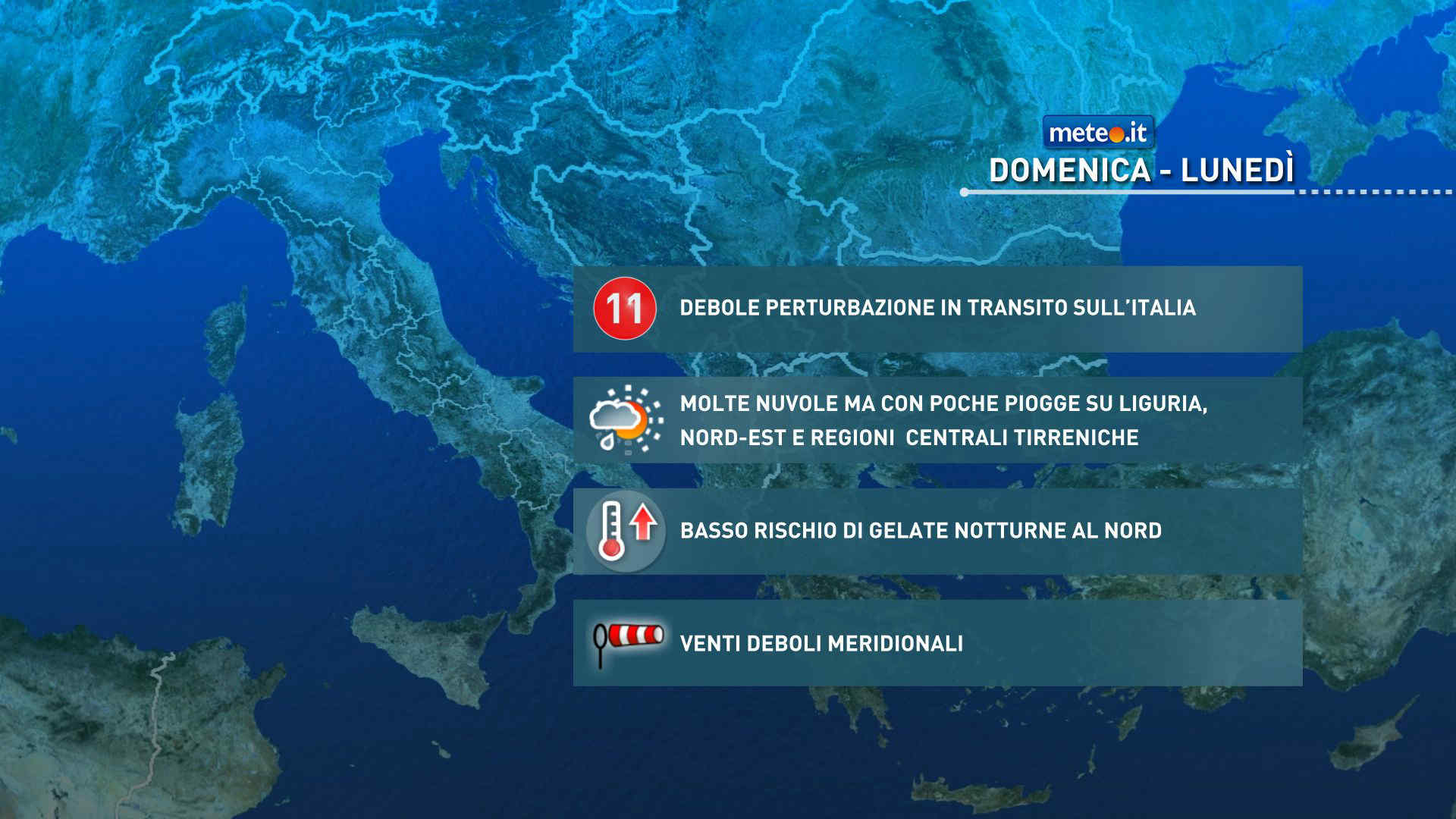 Dopo un sabato stabile quasi ovunque, per la giornata di domenica si conferma l’arrivo di una perturbazione molto debole (la n. 11 di novembre) al Nord, sulle regioni centrali tirreniche e in Sardegna: aumenteranno le nuvole, ma con poche e deboli piogge possibili sol tra Liguria di levante e alta Toscana. Lunedì qualche pioggia sarà possibile anche su Nord-Est, Lazio e Sardegna occidentale. Le temperature massime diurne subiranno un lieve rialzo al Centro-Sud. Al Nord nei prossimi giorni, grazie al ritorno della copertura nuvolosa, si attenuerà il freddo notturno con probabile assenza di gelate all’alba. Martedì qualche pioggia ancora possibile su Liguria, coste del medio Tirreno (fino al nord della Campania), e Sardegna.