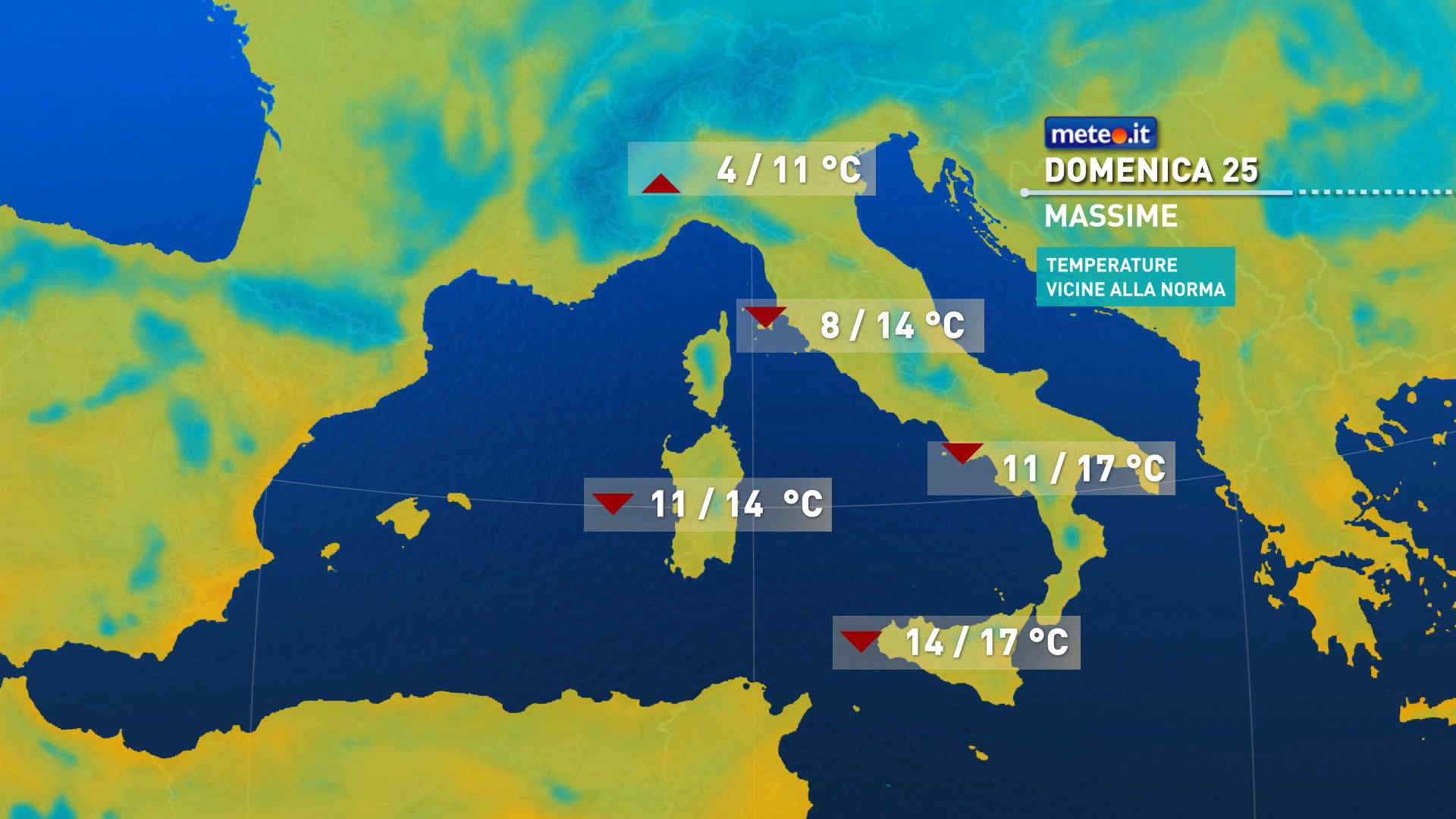 Lunedì inizialmente ancora nubi dappertutto, ma con graduali schiarite al Nord-Ovest e sulle Alpi orientali. Nel corso del giorno piogge sparse, per lo più da deboli a moderate, su gran parte del Centro-Sud e Isole, con nevicate oltre 700-1000 metri su Appennino centrale e zone montuose della Sardegna, al di sopra di 1000-1300 metri su Appennino Meridionale e rilievi della Sicilia. Temperature minime quasi dappertutto in diminuzione; massime in rialzo al Nord-Ovest, stazionarie o in leggero calo altrove.