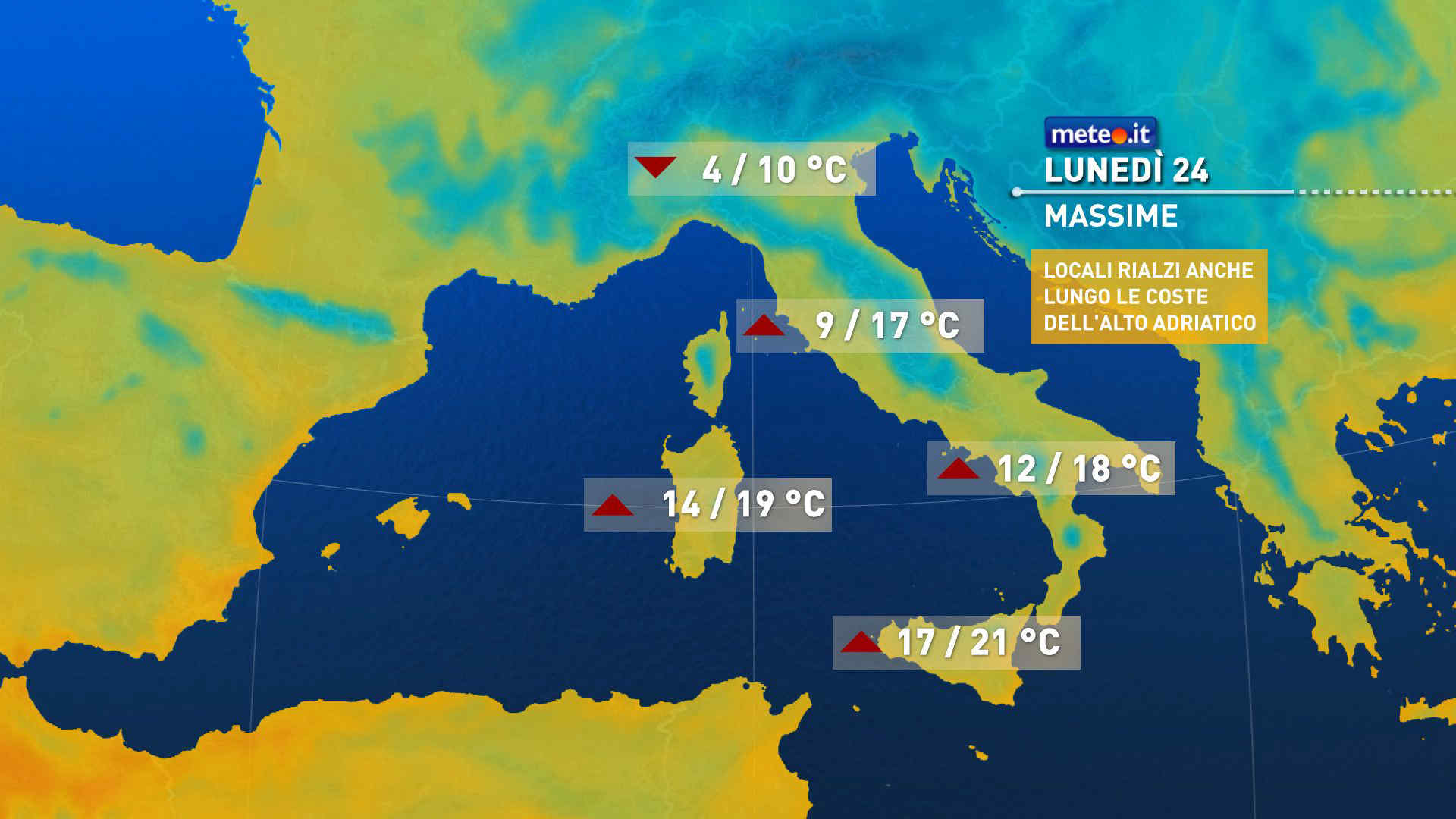 Tempo stabile al Nord-Ovest, Emilia e Toscana, con schiarite sempre più ampie soprattutto dal pomeriggio. Qualche iniziale schiarita anche fra Sicilia e Calabria. Nuvoloso o molto nuvoloso nel resto d’Italia, con piogge sparse, a carattere di rovescio o temporale su medio e basso Tirreno dove non si escludono fenomeni molto intensi, in particolare sulla Campania e zone limitrofe. Nevicate sulle Alpi centro-orientali oltre 800-1200 metri. Precipitazioni meno probabili nei settori ionici dove, però, arriveranno in serata. A fine giornata fenomeni in parziale attenuazione. Temperature minime in aumento, eccetto al Nord-Ovest. Massime per lo più in rialzo, tranne in Sardegna: valori piuttosto miti con punte intorno ai 20 gradi al Sud e in Sicilia. Venti forti di Libeccio al Meridione, di maestrale in Sardegna. Fino ad agitati i mari occidentali.