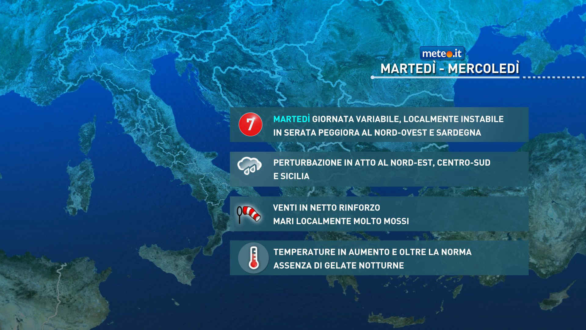 Perturbazione in atto, con piogge soprattutto al Centro-Sud e Isole maggiori; possibili fenomeni a carattere di rovescio o temporale sui settori tirrenici e in Puglia. Al Nord residue piogge a inizio giornata sull’estremo Nord-est tra Venezia Giulia ed Emilia Romagna; durante il pomeriggio fine delle piogge e locali schiarite da Ovest; residue nevicate nelle Alpi di confine tra Piemonte e Valle d’Aosta. Possibili rialzi nelle temperature al Nord e sulla Sardegna.