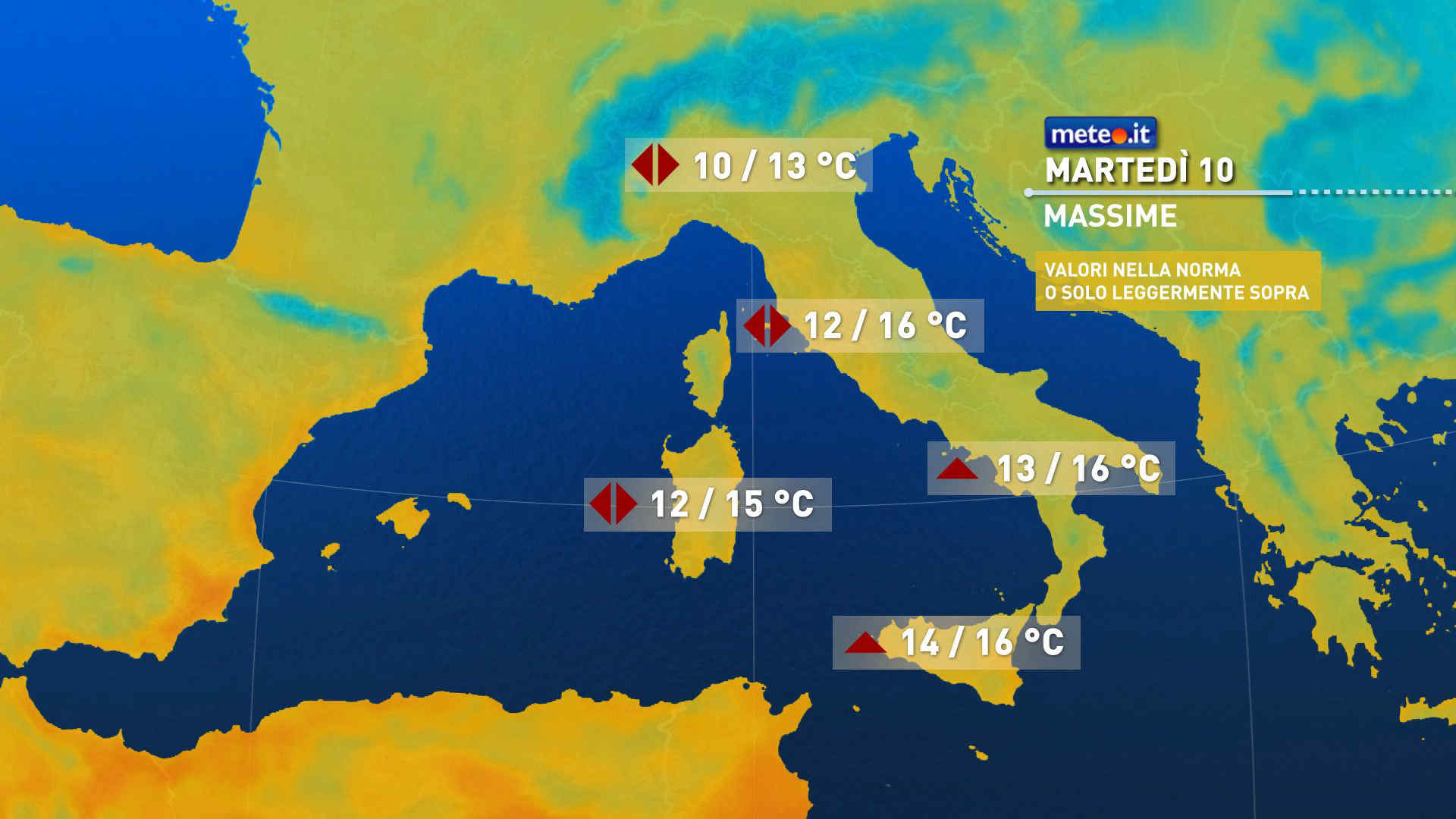 Temperature in lieve calo al Nord-Ovest, in contenuto rialzo in Emilia Romagna, medio Adriatico e regioni meridionali. Assenza di gelate notturne e mattutine. Venti fino a moderati su mari di ponente e Sicilia. Mari poco mossi l’Adriatico, l’alto Tirreno e lo Ionio sotto costa; mossi o molto mossi gli altri bacini.