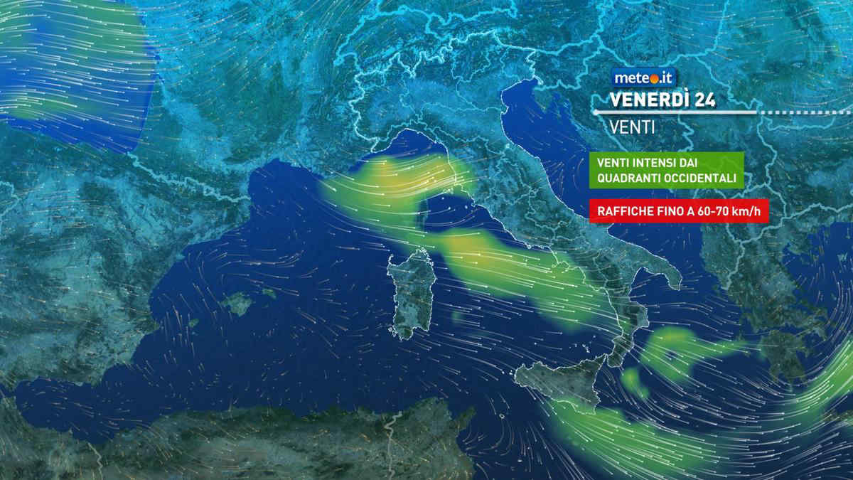 Temperature massime in calo nelle Alpi e al Centro-Sud, per lo più in lieve rialzo al Nord: punte oltre 20 gradi su medio-basso Adriatico e settori ionici. I venti restano sostenuti, con raffiche al Centro-Sud fino a 70-80 Km/h; Foehn al Nordovest. Mari mossi o molto mossi, localmente agitati i bacini di ponente.