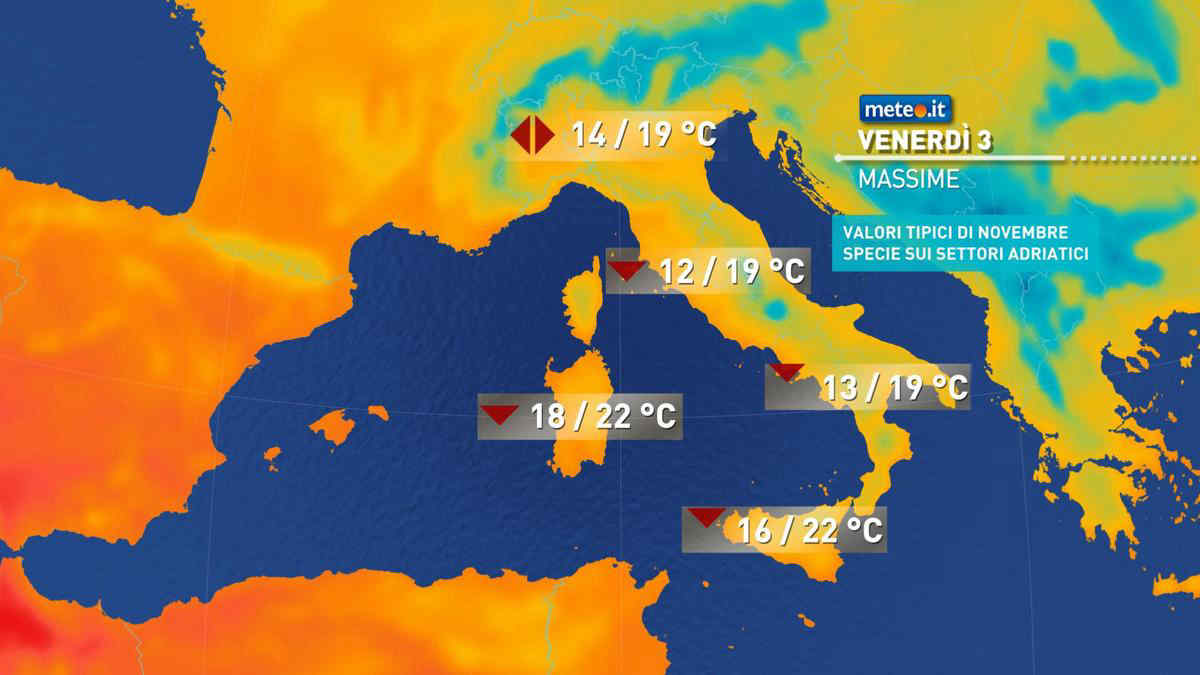 Temperature massime in ulteriore leggera diminuzione su medio Adriatico, Sud e Isole, senza grandi variazioni altrove; valori anche al di sotto della norma, specialmente nelle regioni orientali. Venti da tesi a burrascosi di Tramontana al Centro-Sud, con raffiche tra i 60 e i 90 Km/h.