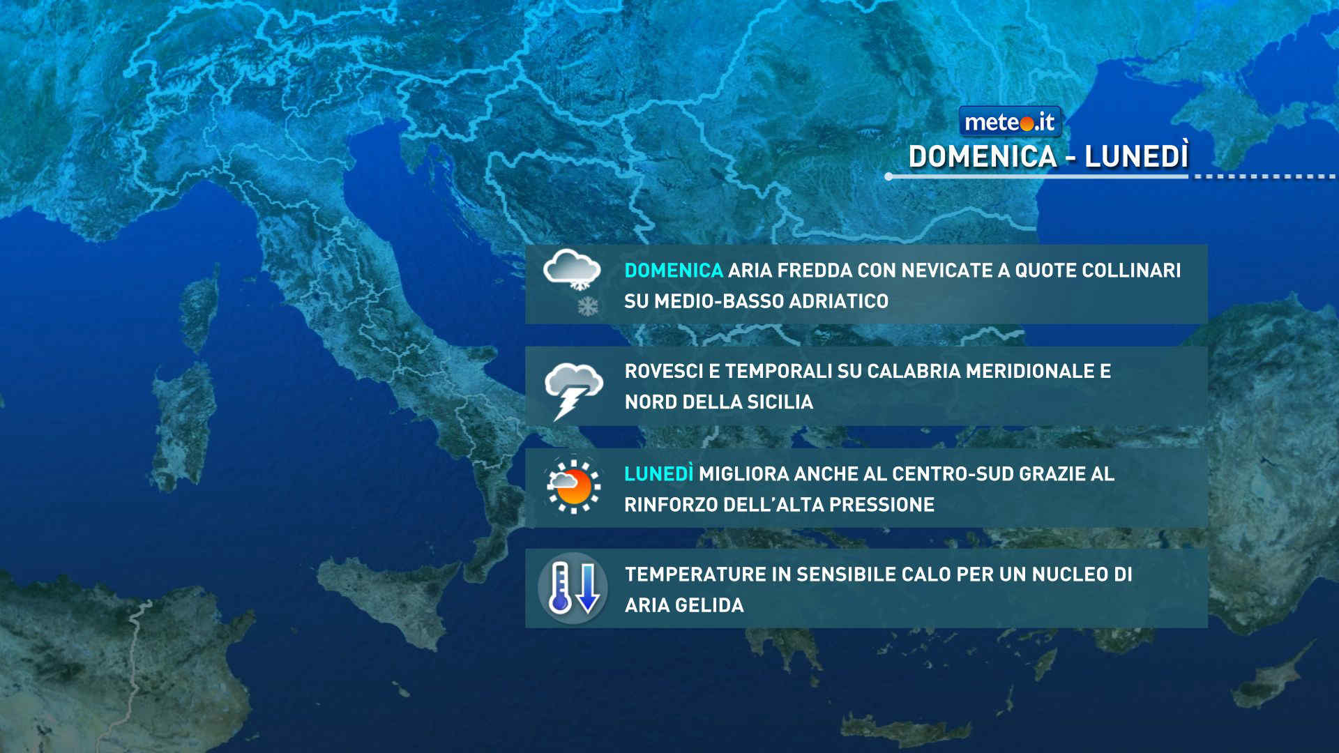 Temperature per lo più in diminuzione, più sensibile dal pomeriggio sulle regioni adriatiche. Gelate mattutine al Nord e interno del Centro. Venti settentrionali, moderati o tesi al Centro-Sud, fino a burrascosi tra Sardegna e Sicilia. Mari mossi o molto mossi.