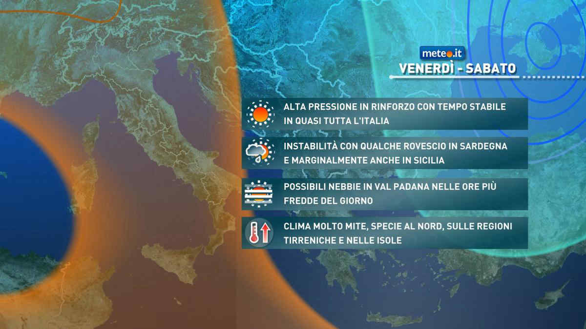 Poche variazioni nelle condizioni meteorologiche sull’Italia. Tempo ancora in prevalenza stabile, eccetto sulle isole maggiori interessate da un po’ di nuvolosità sparsa accompagnata da qualche sporadica pioggia o rovescio. Resta molto probabile la formazione di nebbie nella bassa pianura Padana fra la notte e il primo mattino.