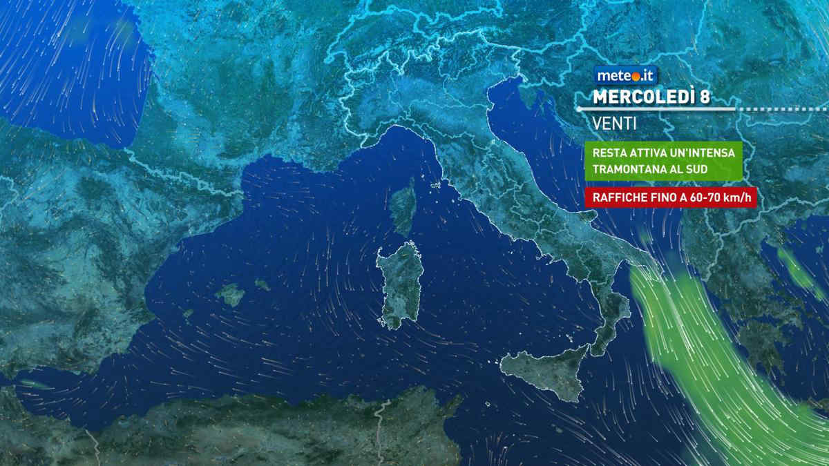 Tempo in prevalenza stabile e soleggiato ovunque. Da segnalare qualche modesto annuvolamento in Sardegna, Molise, Puglia, zone interne del Sud e della Sicilia, ma senza piogge. Entro fine giornata velature ina arrivo al Nord e nubi in aumento in Liguria. Insite la Tramontana da moderata a forte su Molise, regioni meridionali e Sicilia e sui relativi mari; restano molto mossi il basso Adriatico e lo Ionio al largo. Temperature in lieve aumento, con un clima diurno molto mite al Nord, regioni tirreniche e Isole.