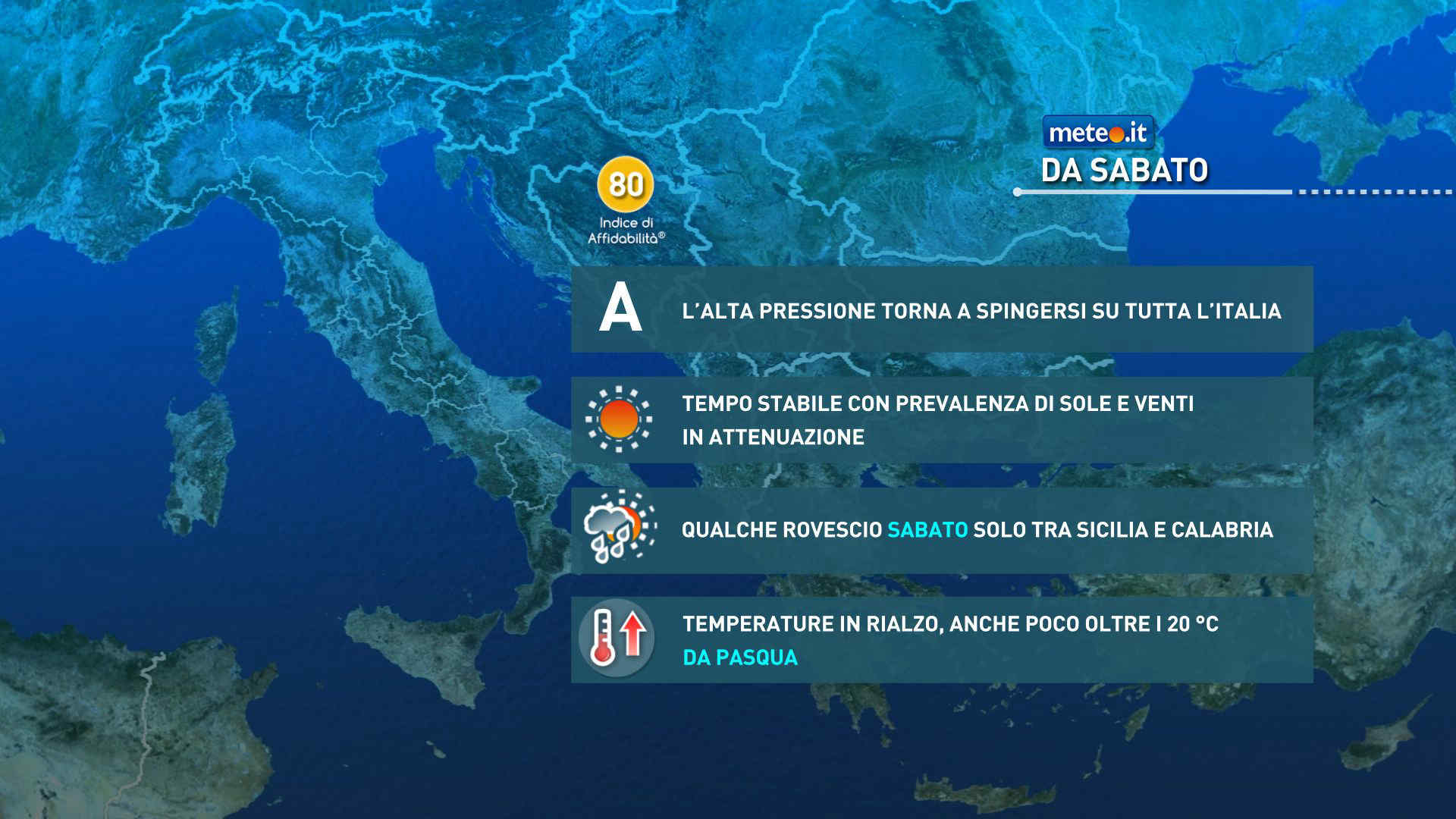 Sabato 4 aprile il tempo sarà in prevalenza soleggiato, a parte qualche annuvolamento al Nord-Est e all’estremo Sud, con possibile sviluppo di brevi rovesci o temporali durante il pomeriggio sui rilievi della bassa Calabria e della Sicilia sud-orientale. Il rialzo termico porterà le temperature massime fino a picchi di 18-20 gradi al Centro-Nord, anche leggermente oltre in Toscana, e sulle Isole, mentre al Sud resteranno leggermente più contenute. Sarà ancora un po’ ventilato per venti settentrionali al Sud e sulle Isole.