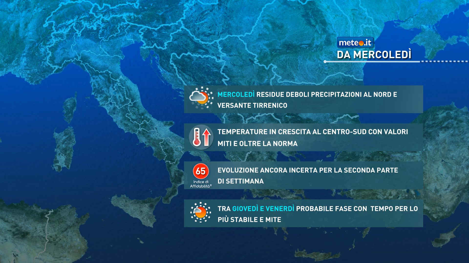 Per l’ultima parte della settimana, tra venerdì e il weekend, le attuali proiezioni confermerebbero l’arrivo dal nord Africa di una perturbazione in risalita verso le Isole e le regioni meridionali con fasi di piogge sparse anche a carattere di rovescio su sud ed est della Sardegna, Sicilia, Calabria e alto Ionio. Al Centro la risalita di nuvole dovrebbe essere associata a uno scarso rischio di piogge possibili in forma solo sporadica. Al Nord, dopo un venerdì e un sabato asciutti anche se non proprio soleggiati, per domenica potrebbe affacciarsi un peggioramento. Una nuova attiva area depressionaria infatti in arrivo dalla Francia ed il Mediterraneo occidentale determinerà le prime precipitazioni sul Triveneto e soprattutto tra il settore ligure e il Nord-Ovest, con neve in quota nelle Alpi.