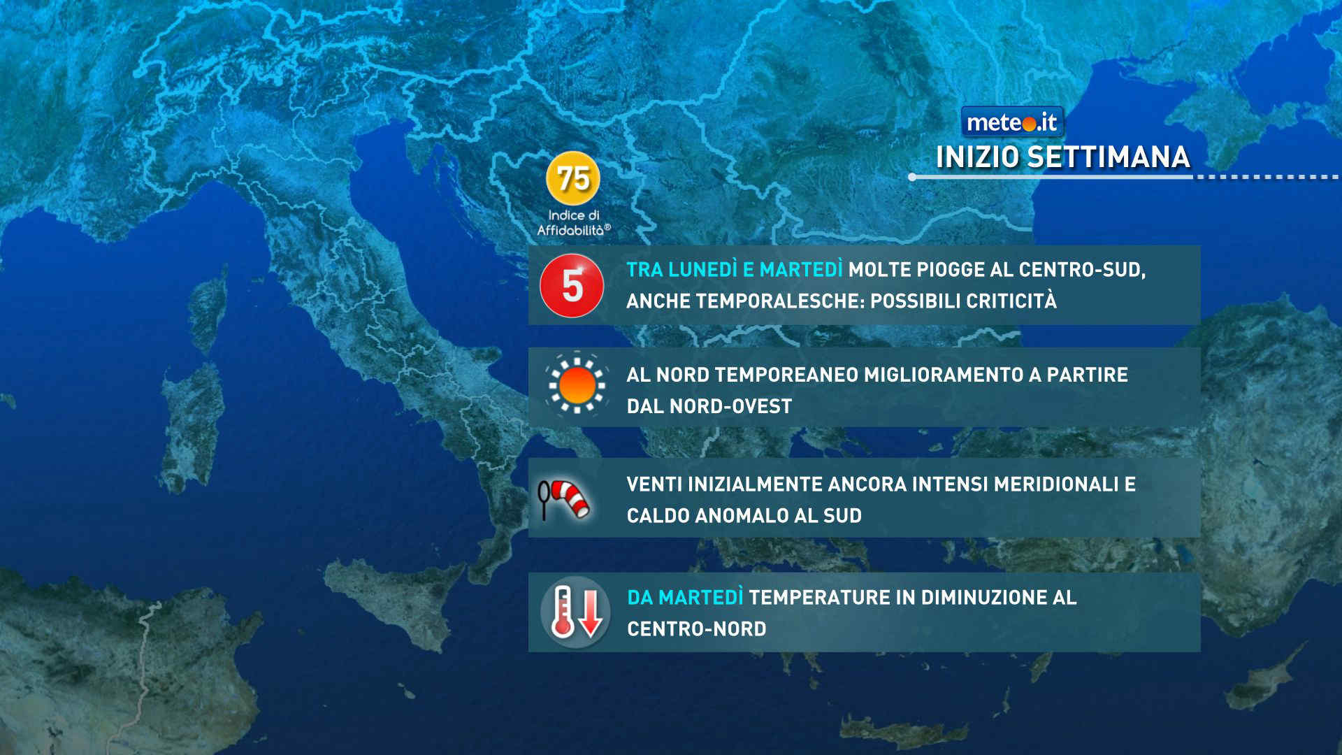 Nel dettaglio, martedì 18 sulla Romagna fino al mattino sarà possibile ancora qualche pioggia: in seguito, come nel resto del Nord, il tempo tenderà a migliorare. Sulle isole e sulle regioni centro meridionali cielo spesso nuvoloso con precipitazioni sparse, in particolare sulle regioni adriatiche, sul basso Lazio e in Campania. A fine giornata peggiora sulla Puglia e sulla Sicilia occidentale, cessano le piogge al Centro. Temperature in calo. Forti venti meridionali sul mare Ionio; intensi venti di Bora o di Tramontana sul mar Adriatico settentrionale, in Liguria e sul nord della Toscana.