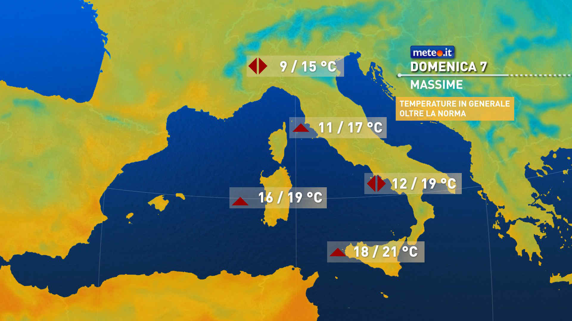 Temperature in rialzo in Sardegna, senza grandi variazioni altrove, con massime tra 9 e 12 gradi al Nord, 12/18 gradi al Centro-Sud, punte di 20/21 nelle Isole. Venti da moderati a forti di Maestrale su medio Adriatico, Sud e Isole. Mari mossi o molto mossi.
