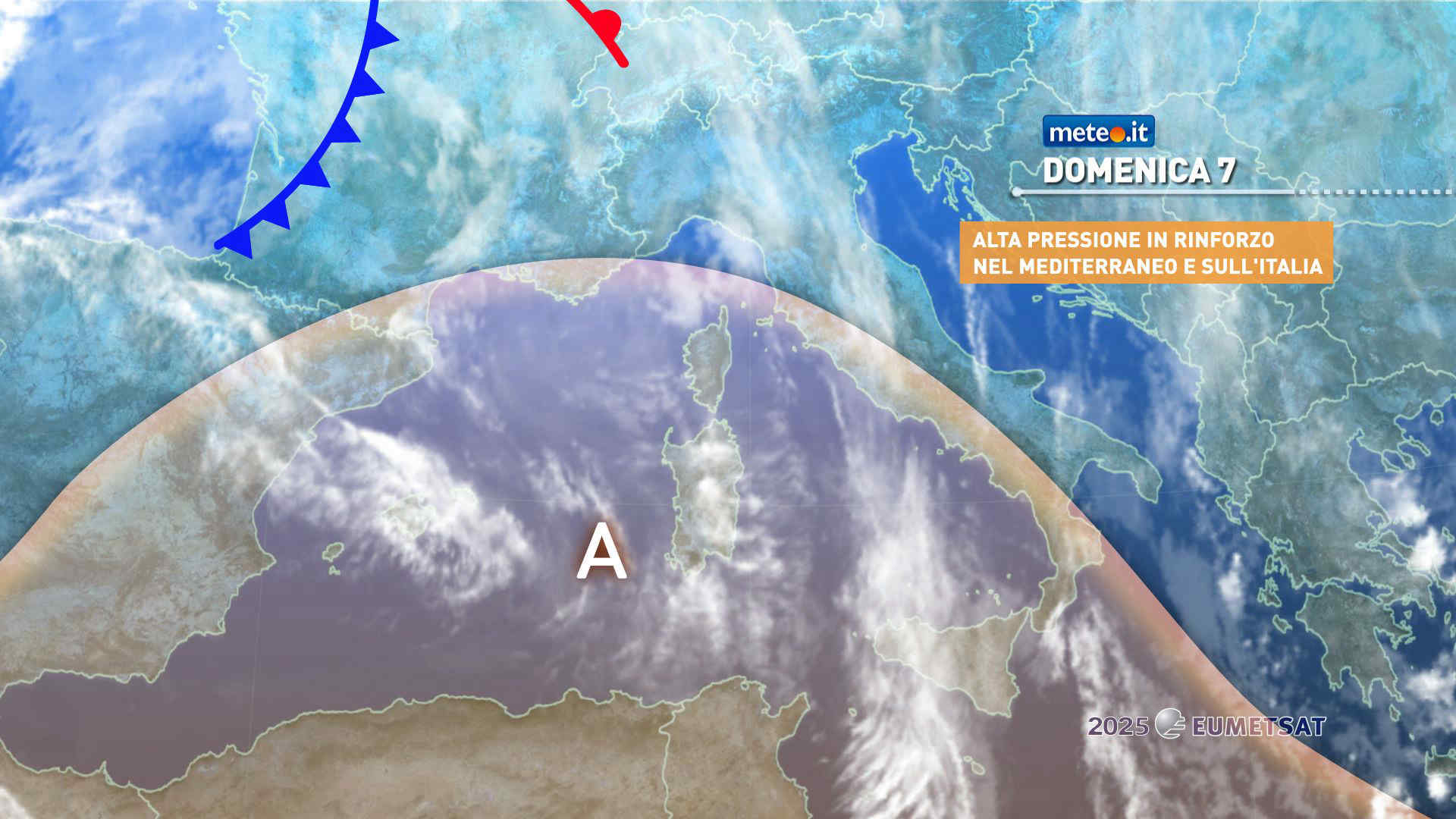 Nei prossimi giorni l’alta pressione sarà protagonista sull’Italia, tenendo così a distanza le perturbazioni e garantendo condizioni nel complesso stabili e miti. In particolare domenica 7 dicembre sul nostro Paese sarà presente della nuvolosità sparsa, con spazio a schiarite, più compatta e associata a qualche pioggia tra bassa Calabria e Sicilia orientale e sulle zone alpine, con deboli nevicate a quote piuttosto alte nei settori settentrionali.