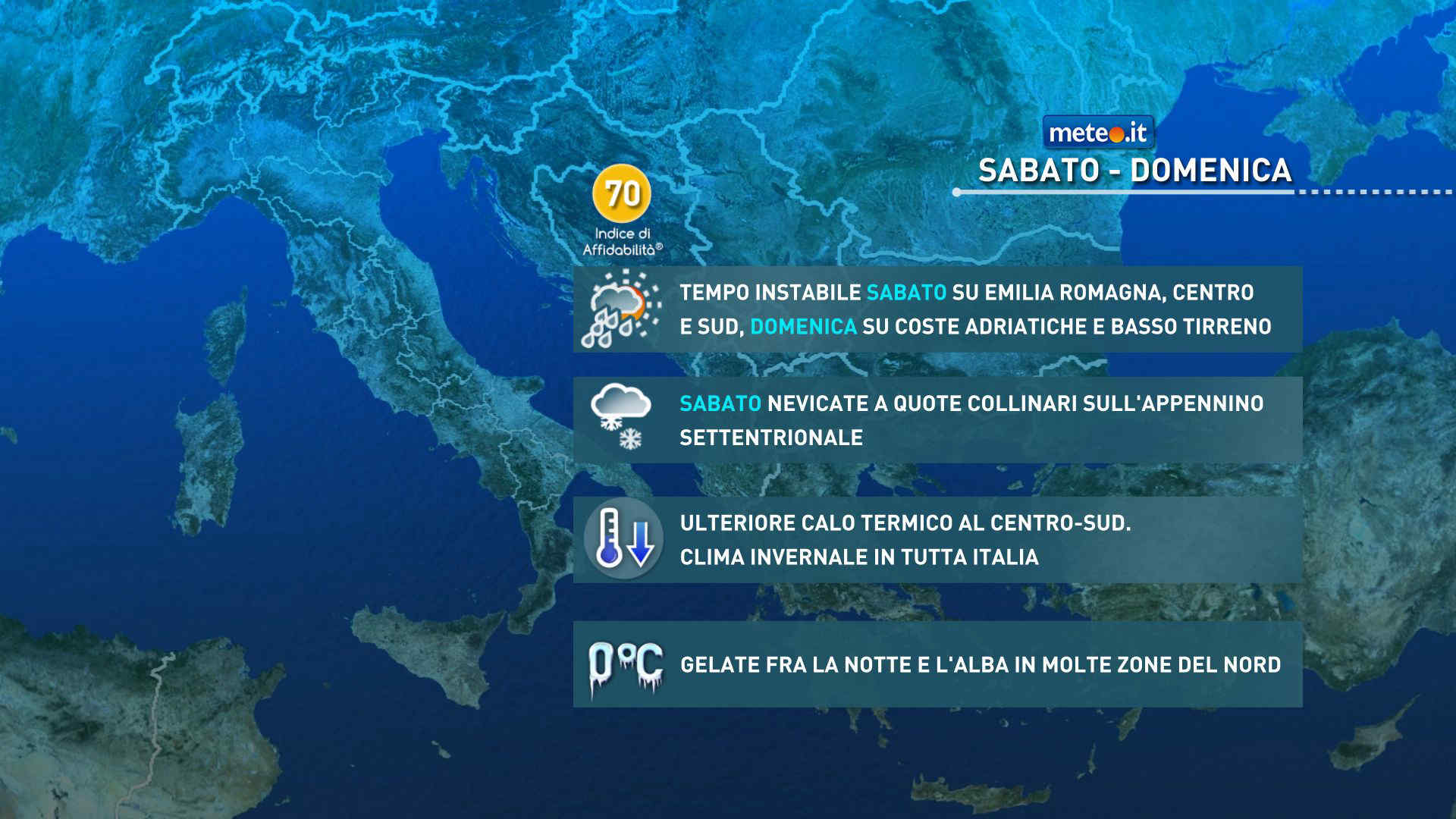 Durante il fine settimana l’aria fredda in arrivo dal Nord Europa concorrerà alla formazione di una circolazione di bassa pressione a ridosso dell’Italia. Le temperature tenderanno a calare ulteriormente, in particolare al Centro-Sud e in Sicilia.