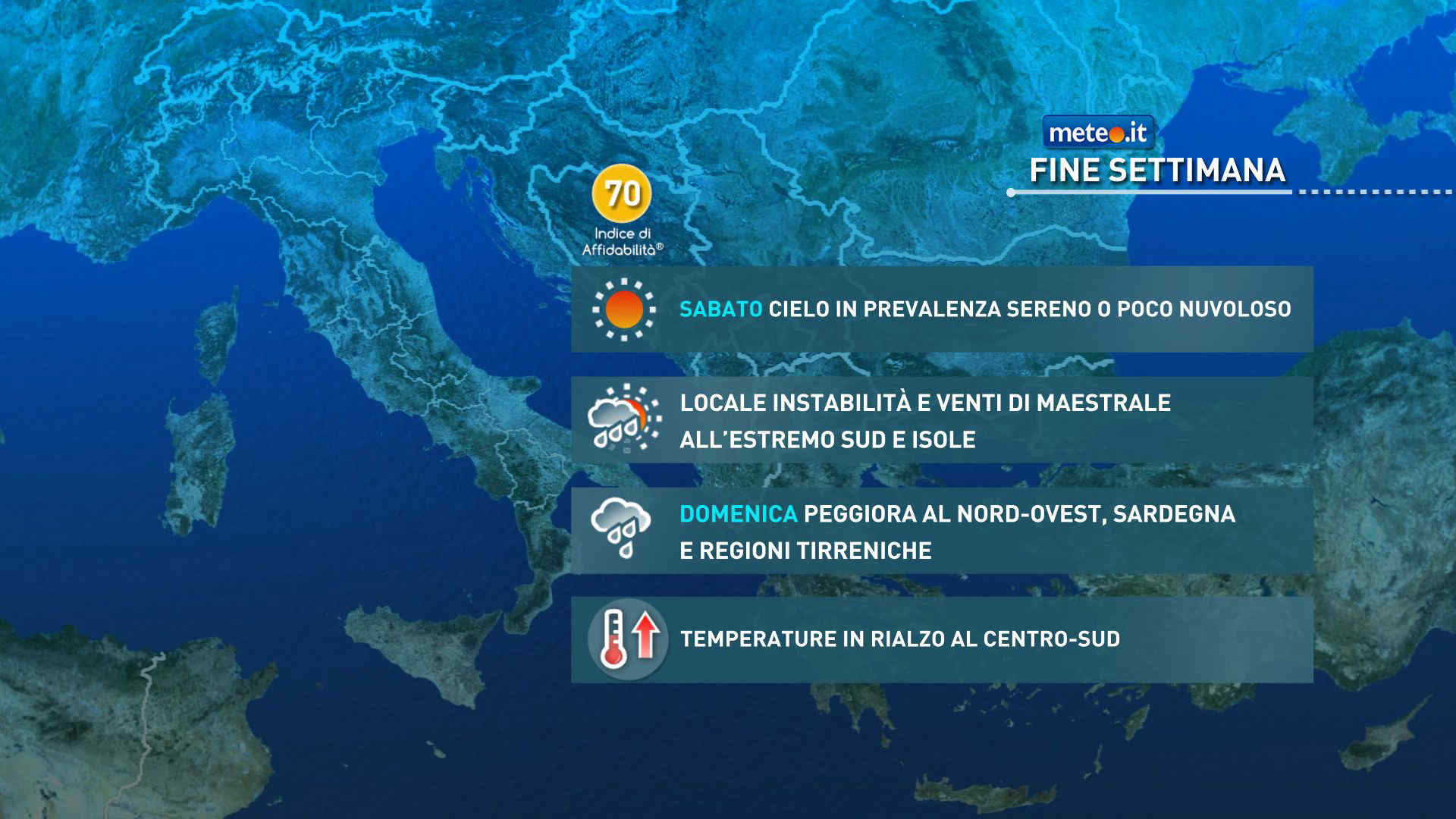 Il fine settimana dovrebbe iniziare con un sabato caratterizzato da un temporaneo rialzo della pressione e tempo più stabile anche al Sud. Nuvole consistenti potrebbero insistere ancora in Puglia con qualche breve pioggia isolata lungo la fascia adriatica e soprattutto tra la bassa Calabria e il nord della Sicilia con residui rovesci soprattutto tra il Reggino e il Messinese; maggiori schiarite nel resto del Meridione. Al Centro prevarranno le schiarite. In Sardegna umidi venti di Maestrale favoriranno nuvole associate a qualche pioggia nell’ovest dell’isola. Al Nord tempo parzialmente soleggiato per il transito di nuvole per lo più alte e associate all’avanguardia di una nuova perturbazione atlantica; possibili banchi di nebbia attorno all’alba nel Polesine. Le temperature minime saranno in calo nelle aree con maggiori schiarite del Centro-Sud; massime per lo più in rialzo. Venti moderati di Maestrale su Adriatico, alto Ionio e Isole.
