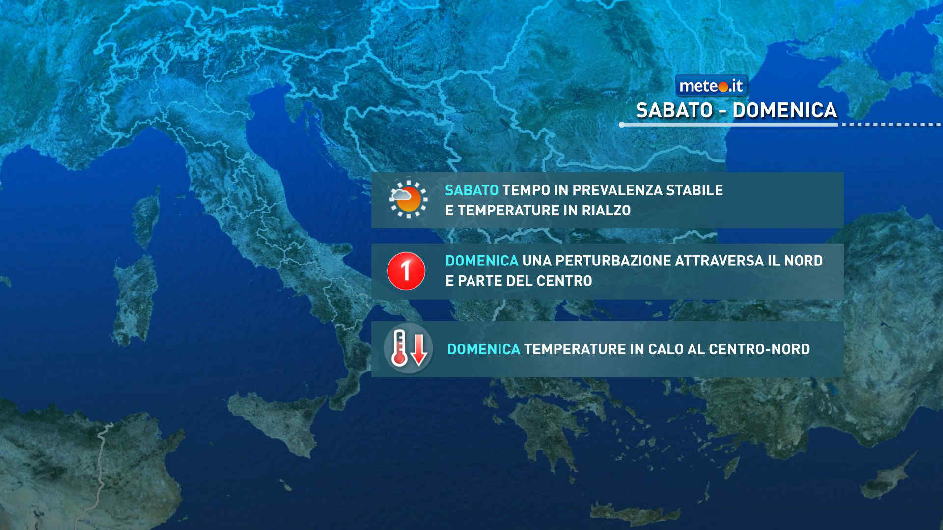 Sabato al mattino prevalenza di bel tempo in Abruzzo, Molise e Lazio; nuvole sul resto del Paese, con qualche debole pioggia possibile su Liguria, Alto Piemonte, Alpi lombarde, Calabria e Sicilia orientale; qualche nebbia nelle valli del Centro. Nel pomeriggio cielo in generale sereno o poco nuvoloso su regioni centrali, Campania, nord della Puglia e Sardegna; nuvole altrove, con piogge isolate su Liguria, Calabria e Sicilia. Temperature massime quasi dappertutto in leggera crescita, venti per lo più deboli.