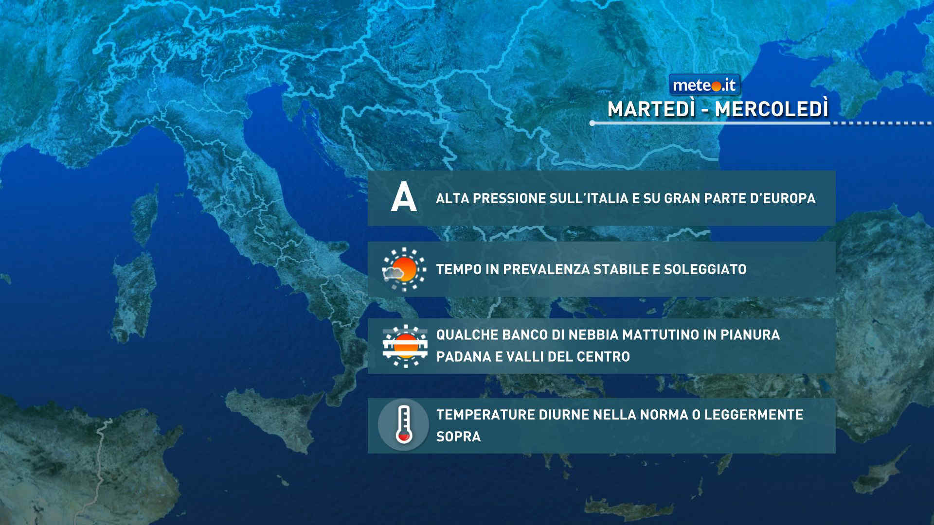 Temperature senza grandi variazioni: valori del primo mattino ancora piuttosto bassi al Centro-Nord, non escluse locali brinate nelle regioni settentrionali; massime pomeridiane nella norma o leggermente oltre con valori per lo più tra 15 e 20 gradi. Venti in prevalenza deboli, salvo moderati rinforzi di Maestrale sul medio-basso Adriatico e intorno alla Sicilia. Mari: localmente ancora un po’ mossi i mari del Sud, calmi o poco mossi i restanti bacini intorno alla nostra penisola.