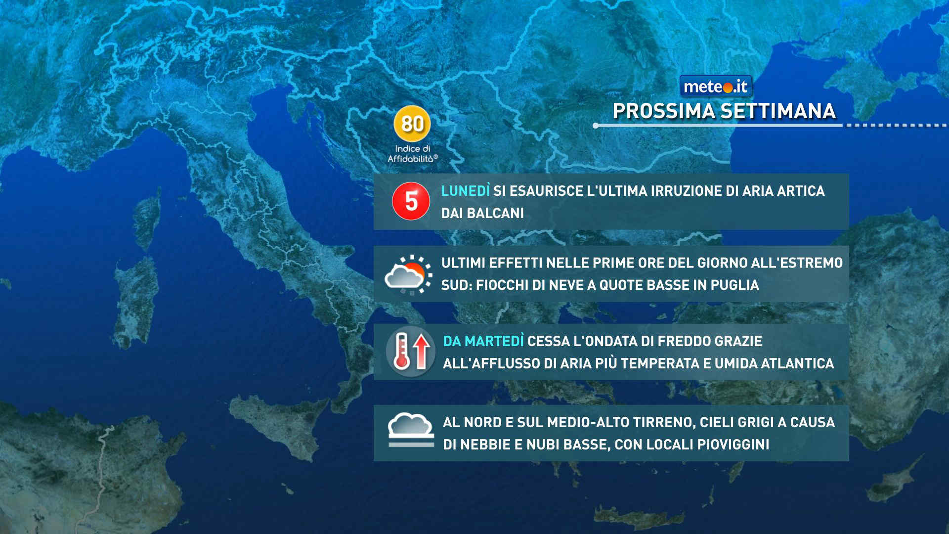 Gli ultimi aggiornamenti meteo confermano che la prossima settimana si aprirà lunedì con freddo ancora intenso in tutta Italia, e soprattutto al Centro-Nord. Da martedì, tuttavia, si profila un cambio di circolazione che vedrà l'Italia nel mirino di correnti più miti e umide: di conseguenza il freddo tenderà ad attenuarsi, ma arriverà anche qualche pioggia.