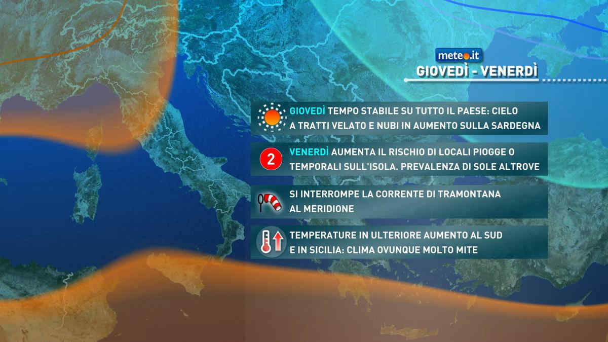 L'alta pressione si sta estendendo verso l'Italia, dando il via a una fase meteo segnata da un tempo per lo più stabile e un clima insolitamente mite per la stagione con l'afflusso di aria più calda anche al Sud. Anche sulle regioni meridionali si sta infatti attenuando rapidamente il flusso di correnti settentrionali, con forti venti di Tramontana responsabili di temperature inferiori alla norma.