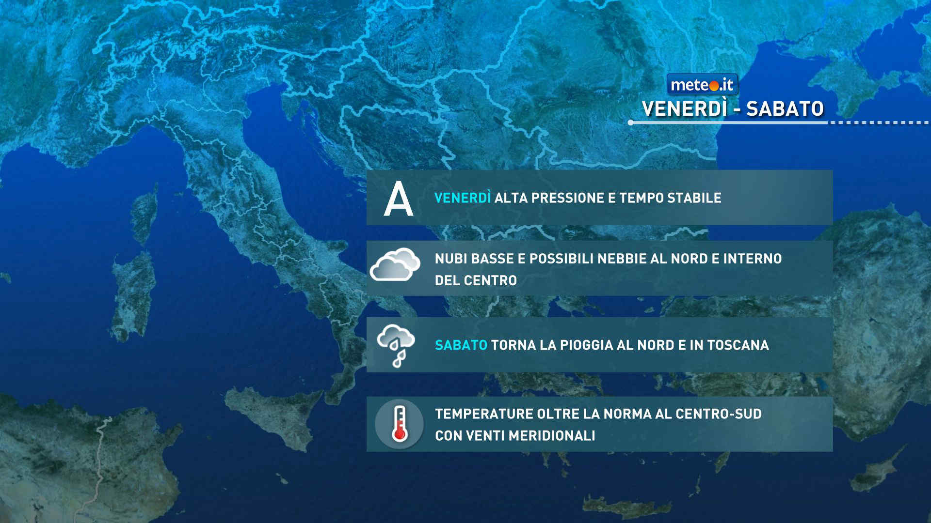 Al mattino cielo molto nuvoloso o grigio per nubi basse, foschie e possibili nebbie su pianure e coste al Nord, in Toscana, e Umbria; sereno o poco nuvoloso altrove, con locali banchi di nebbia in Campania e Salento. Nel pomeriggio nuvole in parziale diradamento, ma più insistenti in Piemonte e Liguria, con pioviggine sulle Liguria centrale. Dalla sera nubi di nuovo in aumento in Lombardia, Venezie e Toscana; piogge sparse nelle regioni di Nord-Ovest. Temperature minime in leggero rialzo al Nord, massime in calo al Nord-Ovest, in lieve aumento al Sud e Isole. Venti di Scirocco sui mari di ponente.