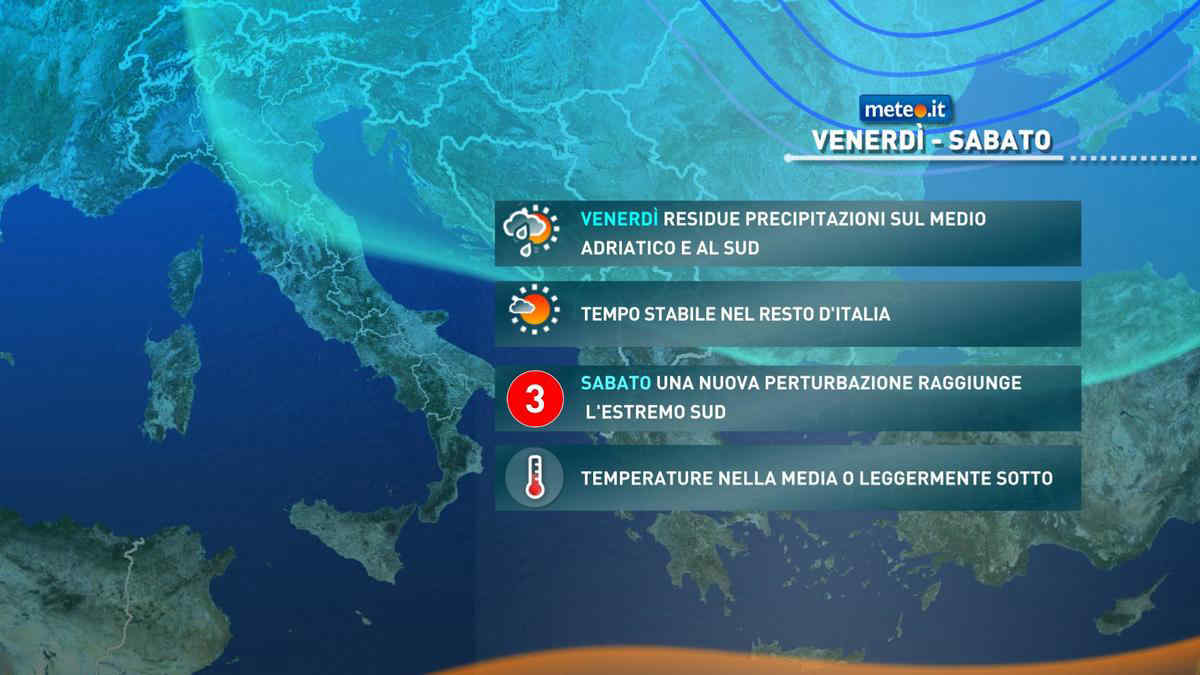 Nel frattempo, una nuova perturbazione di origine nordafricana si sta avvicinando alle nostre regioni meridionali, e tra sabato e domenica attraverserà rapidamente la Sicilia e la Calabria. Le temperature non subiranno grandi variazioni, rimanendo vicine ai valori normali per il periodo.