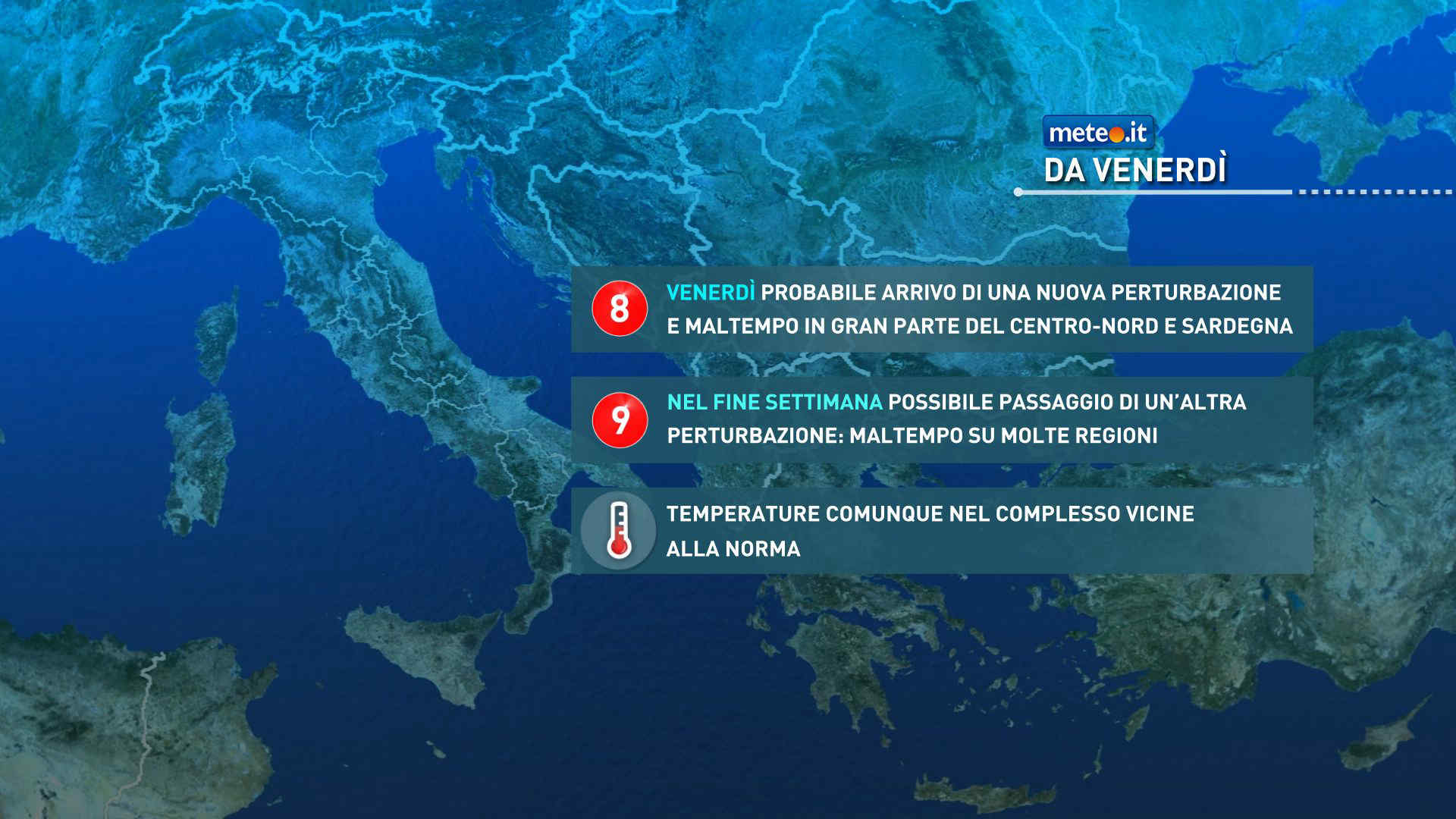 Venerdì 23 la perturbazione numero 8 del mese porterà un peggioramento che dal Nord-Ovest e dalla Sardegna si estenderà a tutte le regioni settentrionali e a quelle centrali tirreniche, fino alla Campania in serata. Il resto del Sud e la Sicilia vedranno solo della moderata nuvolosità.