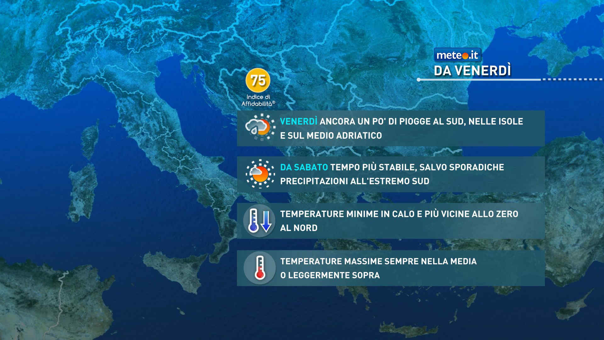 Ne conseguirà un rapido miglioramento e un sabato complessivamente più stabile in quasi tutto il Paese, con prevalenza di tempo buono e soleggiato, salvo il passaggio di velature al Centro-Nord e una residua nuvolosità al Sud e sulle Isole, accompagnata dalle ultime locali piogge a inizio giornata su Puglia e Sicilia settentrionale.