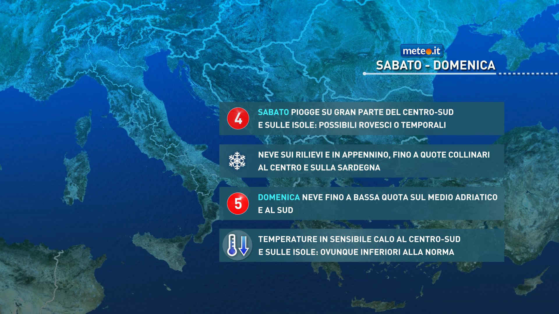 Nel frattempo la perturbazione n.4 di gennaio completerà il suo passaggio sopra la Penisola e i mari prospicienti, dando luogo a una fase di maltempo, associata a piogge, nevicate a quote collinari, venti di tempesta e mareggiate sulle coste esposte. Domenica il tempo andrà miglioramento, ma un altro impulso molto freddo dai Balcani raggiungerà rapidamente le regioni adriatiche, per attraversare l’estremo Sud entro le prime di lunedì, favorendo una breve fase di neve a quote molto basse.