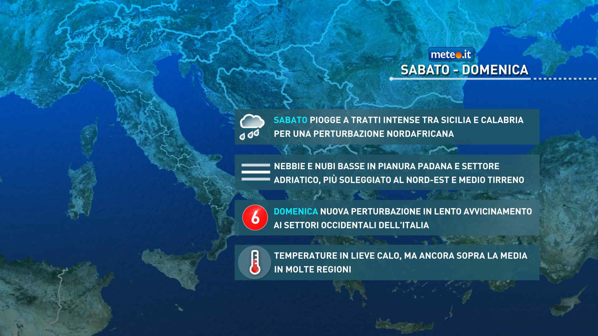 L’alta pressione va gradualmente attenuandosi sotto la spinta di due perturbazioni. La prima (la n.5 di dicembre) proveniente dal Nord Africa, sta interessando l’estremo Sud e si allontanerà domenica. La seconda (la n.6) in lento avvicinamento dall’Europa occidentale, darà i suoi effetti domenica all’estremo Nord-Ovest e sulle isole maggiori. Nel resto del Paese il tempo resterà abbastanza stabile, a parte ancora qualche precipitazione in Liguria, e con diffusa presenza di nebbie e strati nuvolosi bassi.