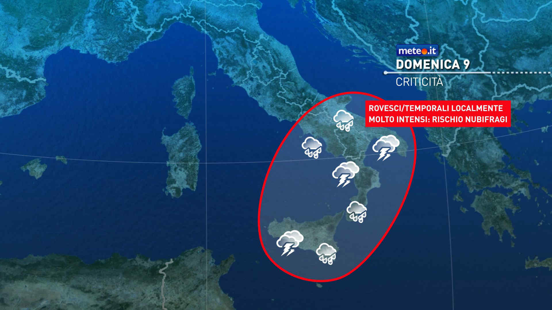 Tra la notte e il primo mattino ultime precipitazioni tra Abruzzo, Molise e regioni del Sud peninsulare. Strati di nubi basse su Emilia Romagna e Marche, cielo sereno o poco nuvoloso altrove, ma con tendenza a un rapido peggioramento su Sardegna e ovest Sicilia dove giungeranno le prime locali piogge. Dal pomeriggio fenomeni più diffusi sulla Sardegna, in successiva estensione alla Campania, nella notte anche al resto della Sicilia, a Basilicata e Puglia. Il tempo resta in prevalenza soleggiato al Nord e su Toscana, Umbria e alto Lazio.