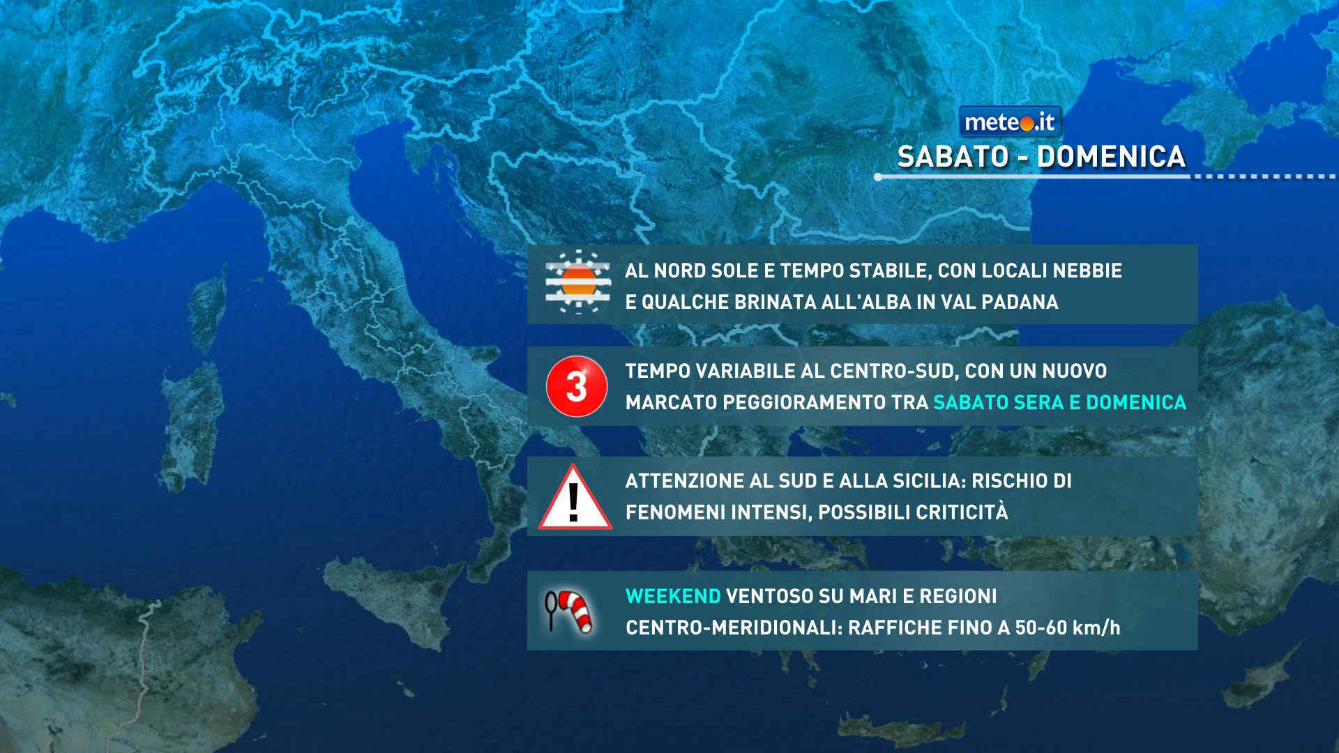 La prima perturbazione è già in transito sull’Italia e abbandonerà il Sud nella mattinata di sabato, seguita a ruota da un secondo sistema perturbato che investirà dapprima la Sardegna per poi raggiungere tra sabato sera e domenica anche la Sicilia e il resto del Sud, coinvolgendo marginalmente anche le regioni centrali. Attenzione perché non possiamo escludere fenomeni localmente molto intensi e abbondanti, sotto forma di nubifragi, con conseguenti situazioni di criticità.