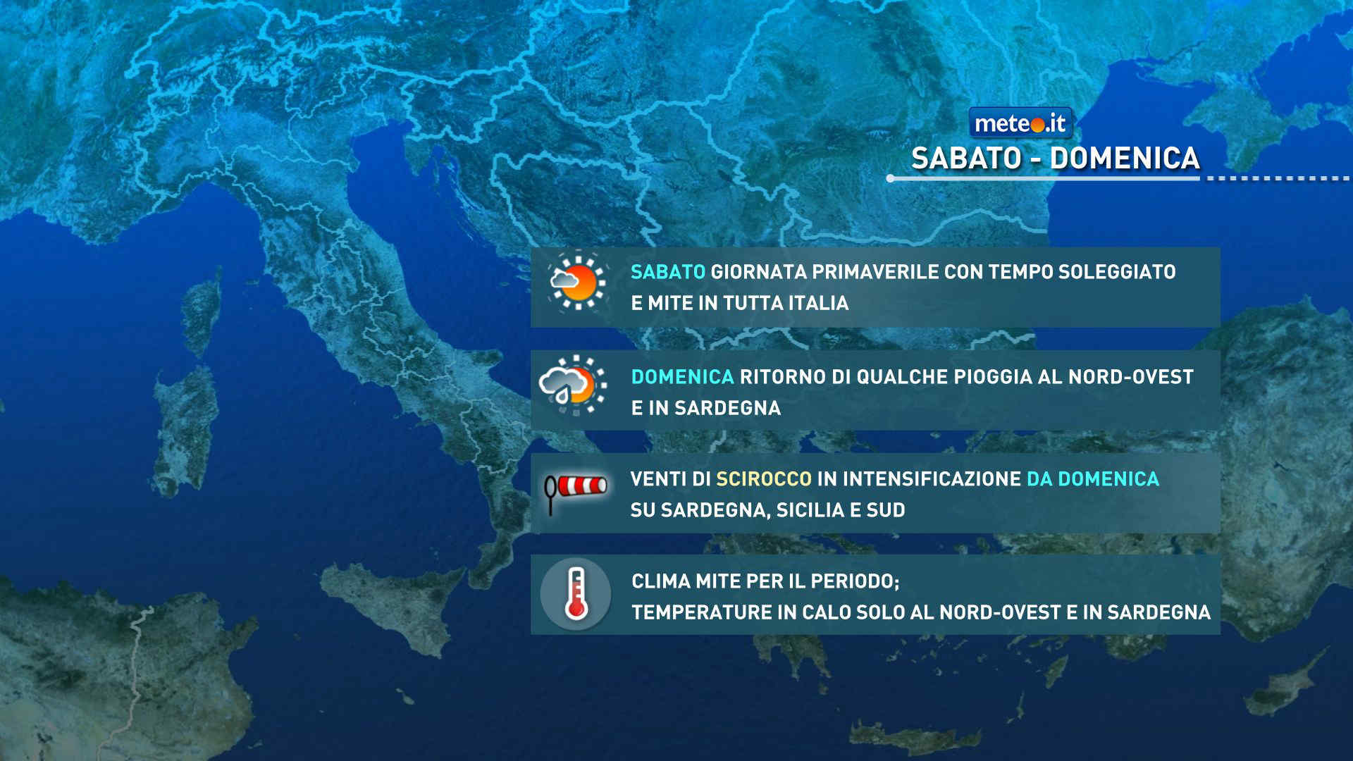 Temperature in calo nei valori massimi sull’estremo Nord-Ovest e in Sardegna, senza grandi variazioni nel resto d’Italia con un clima che resta molto mite. Venti in rinforzo al Centro-Sud, fino a tesi o localmente forti di Scirocco intorno a Sicilia e Sardegna; rinforzi da est su alto Adriatico, Pianura Padana e da nord in Liguria. Molto mossi i canali delle due Isole maggiori; tendenti a mossi il Tirreno, lo Ionio, l’Adriatico e il Ligure occidentale.